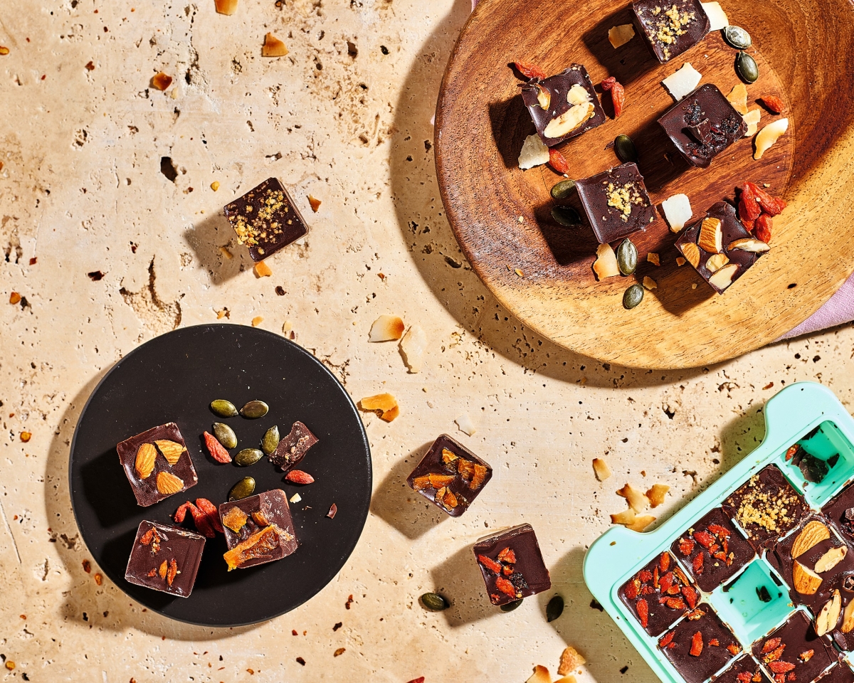 “Cacao has phytonutrients that improve cognition, executive function, mood, insulin resistance and blood pressure. It also contains theobromine, which offers a longer lasting, more relaxed energy without the spike and crash of caffeine. The phytonutrient-rich dried fruit, seeds and nuts add crunch, saltiness and sweetness.”