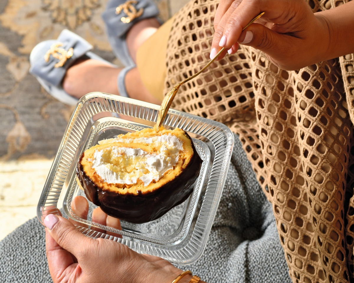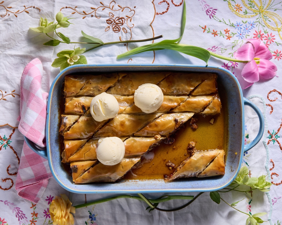 “Of late, my mum always visits bearing a tray of her chocolate éclairs, which my twins like to point out don’t have enough ganache ‘like mummy does it’. I’d imagined eating one large éclair for the longest time, so this is a twist on a classic – a reimagined Swiss roll using a choux pastry dough instead of traditional sponge. To finish, a generous spoon of milk chocolate ganache, enough to get the approval of my twins. It’s a dessert that feels both nostalgic and new.”