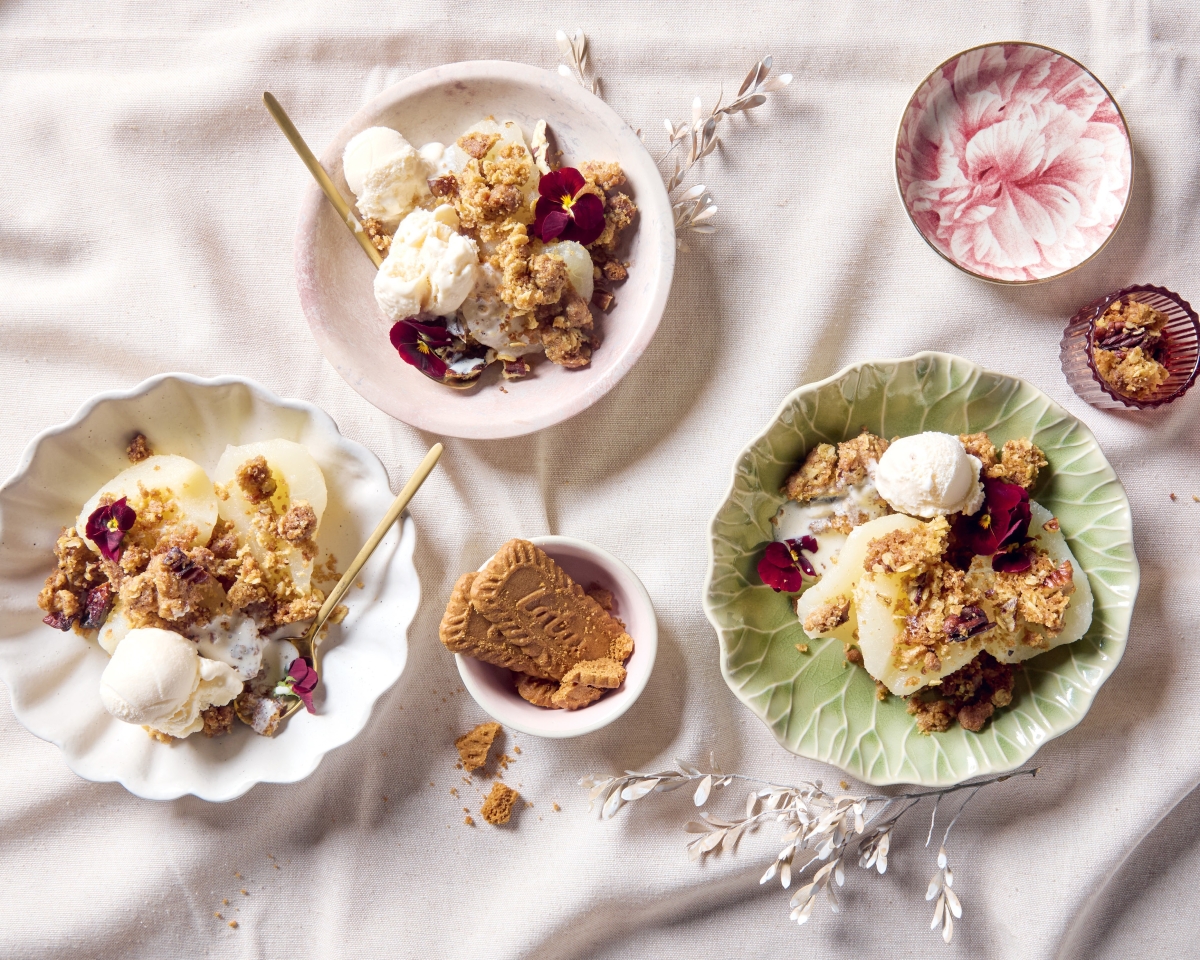 Tender pears meet buttery pecans and spiced Biscoff crumble in this easy, crowd-pleasing dessert, baked golden in 30 minutes and best served warm with ice cream, cream or custard always.