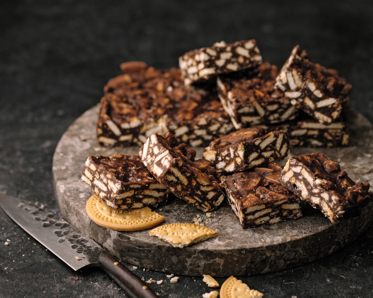“Bakers Biscuits first started producing Britain’s iconic Marie biscuit in South Africa in 1898 (the original biscuit was created in London in 1874 to commemorate the wedding of the Grand Duchess Maria Alexandrovna of Russia and the Duke of Edinburgh). Since its introduction on local soil, the biscuit’s popularity soared and it was only a matter of time before it was used as an ingredient in other confections and desserts. These easy chocolate-biscuit squares are loved all across South Africa. Rarely will you find a bake sale without it. Made with the humble but popular Marie biscuit, this no-bake recipe also contains icing sugar, cocoa powder, butter and an egg. The magic of good Marie biscuit fudge lies in not crushing the biscuits too finely, so that the pieces of biscuit are clearly visible from the cut sides of the squares, and you can feel the tender crunch when you bite into one.”